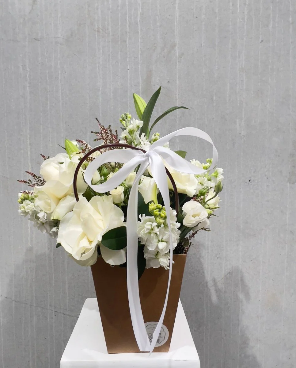 Snow-White Handbag - a unique and stylish way to show off your love of flowers! This handbag is made with a selection of white and green seasonal flowers, making it the perfect accessory for any occasion. The bag is lightweight and comfortable to carry, and its unique design is sure to turn heads.
